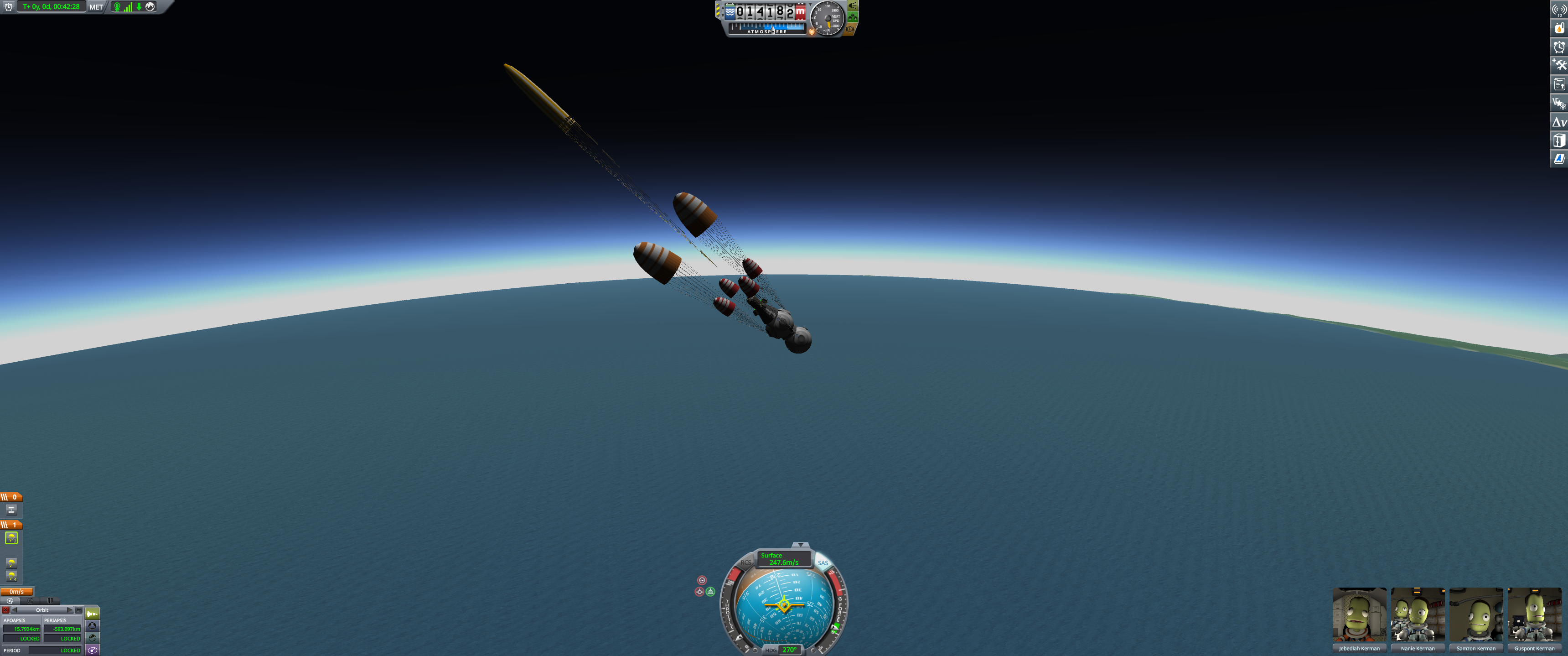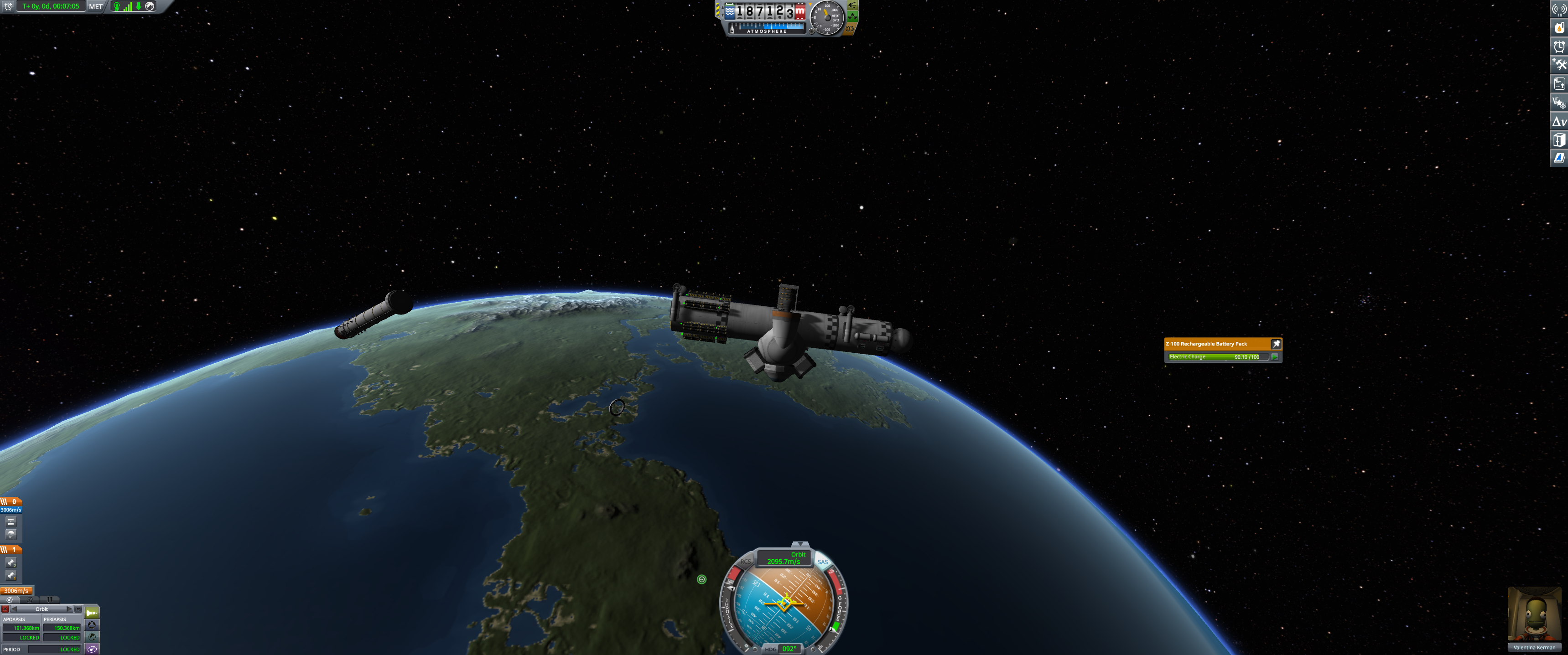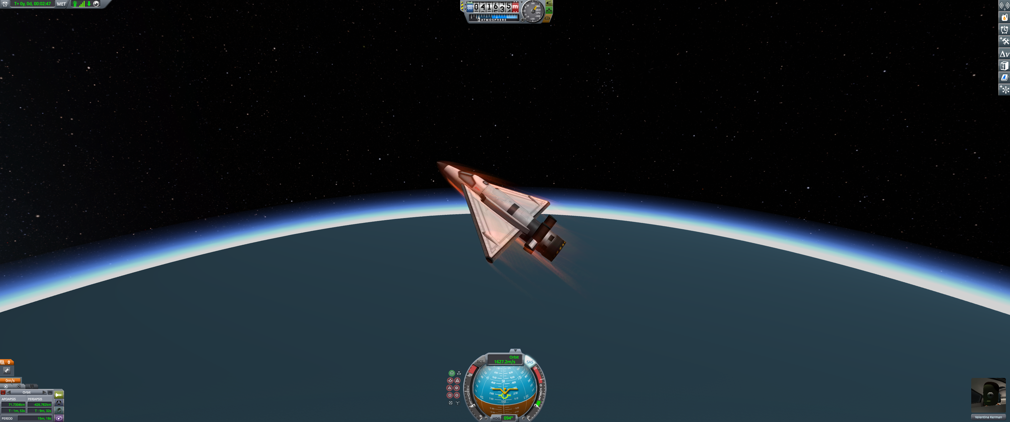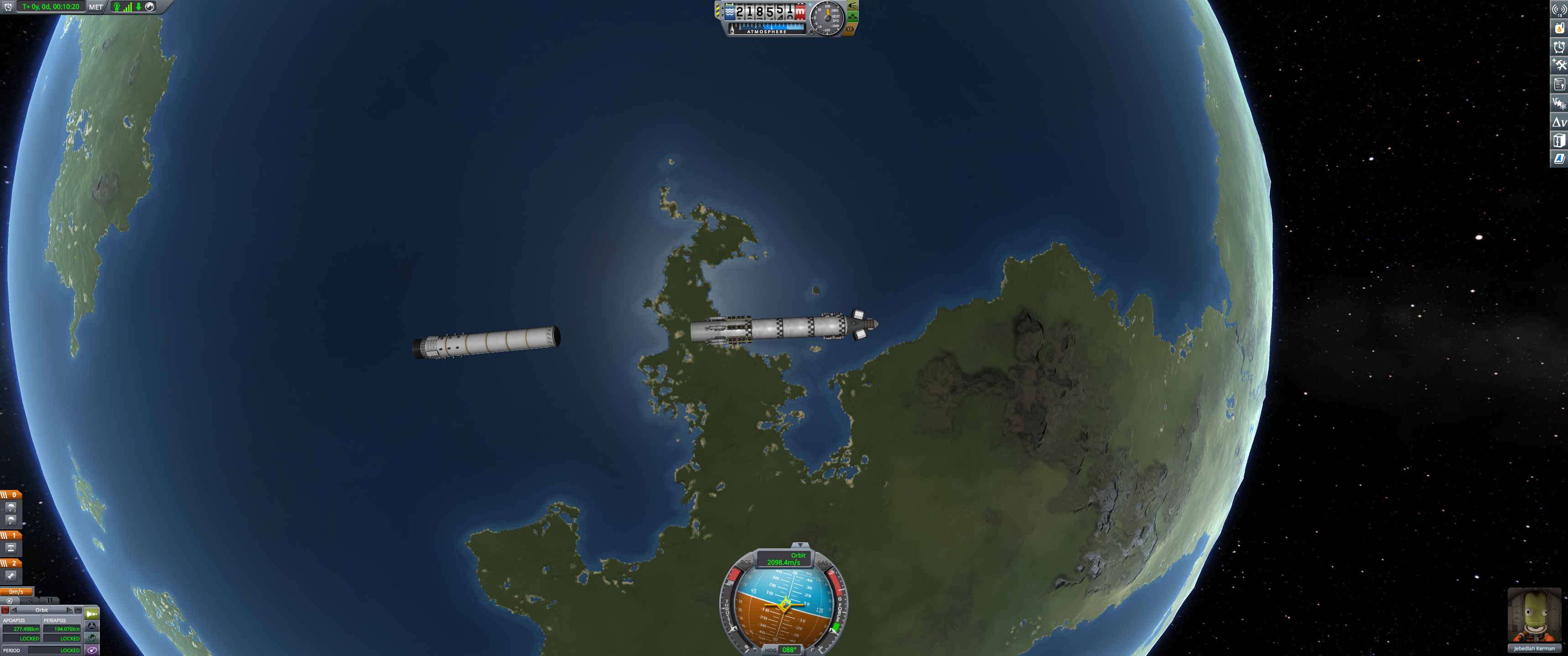 Booster and lander coasting peacefully over Kerbin. Orbital info in bottom left. (Dec 18 2025)