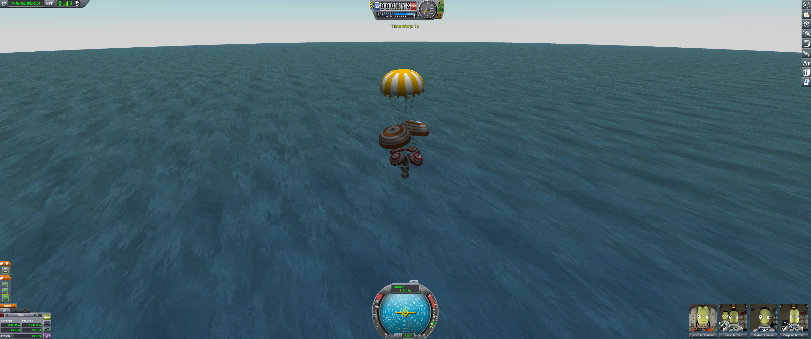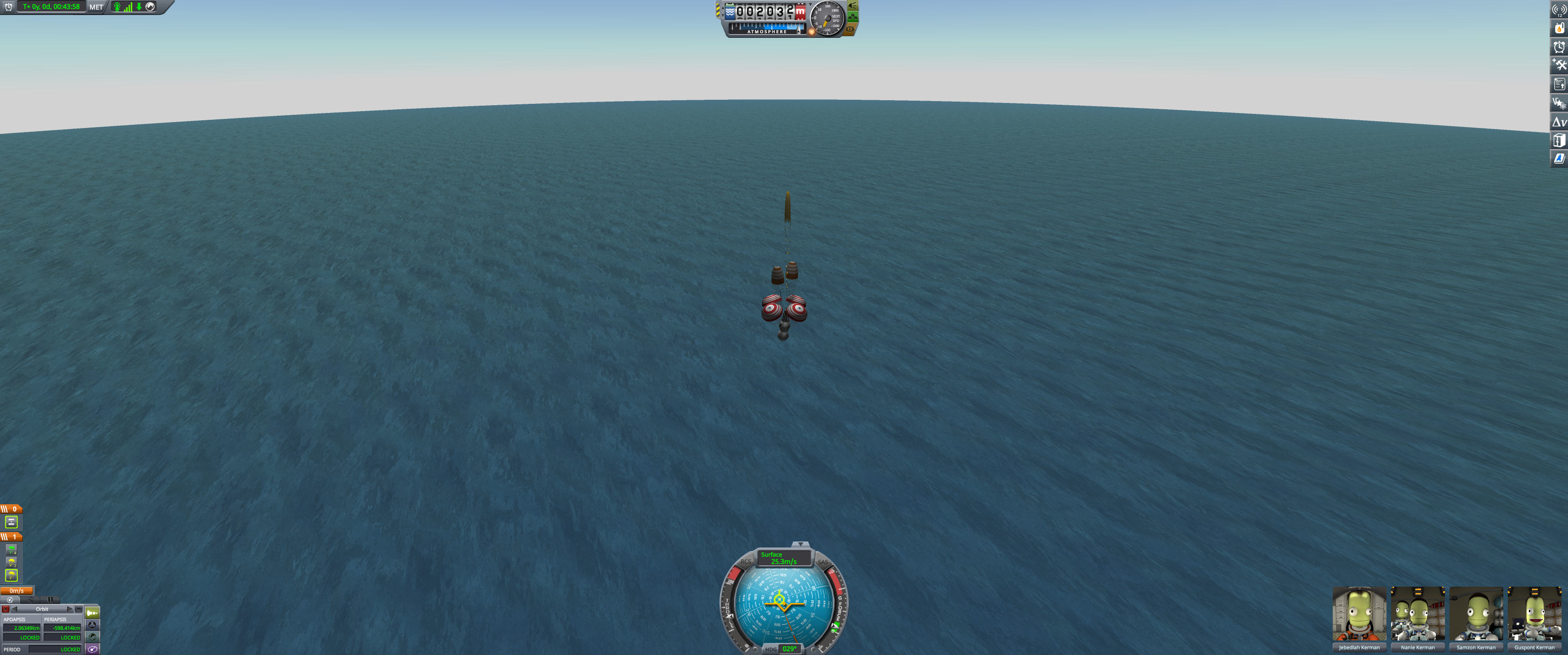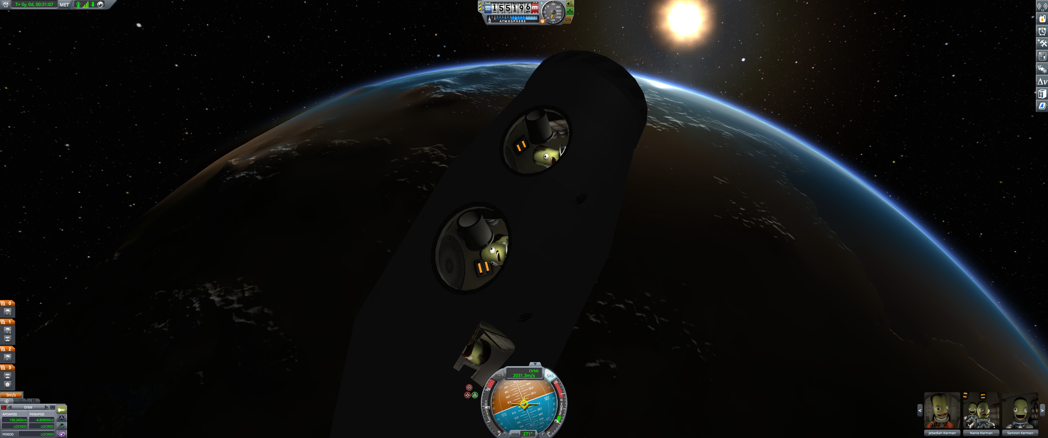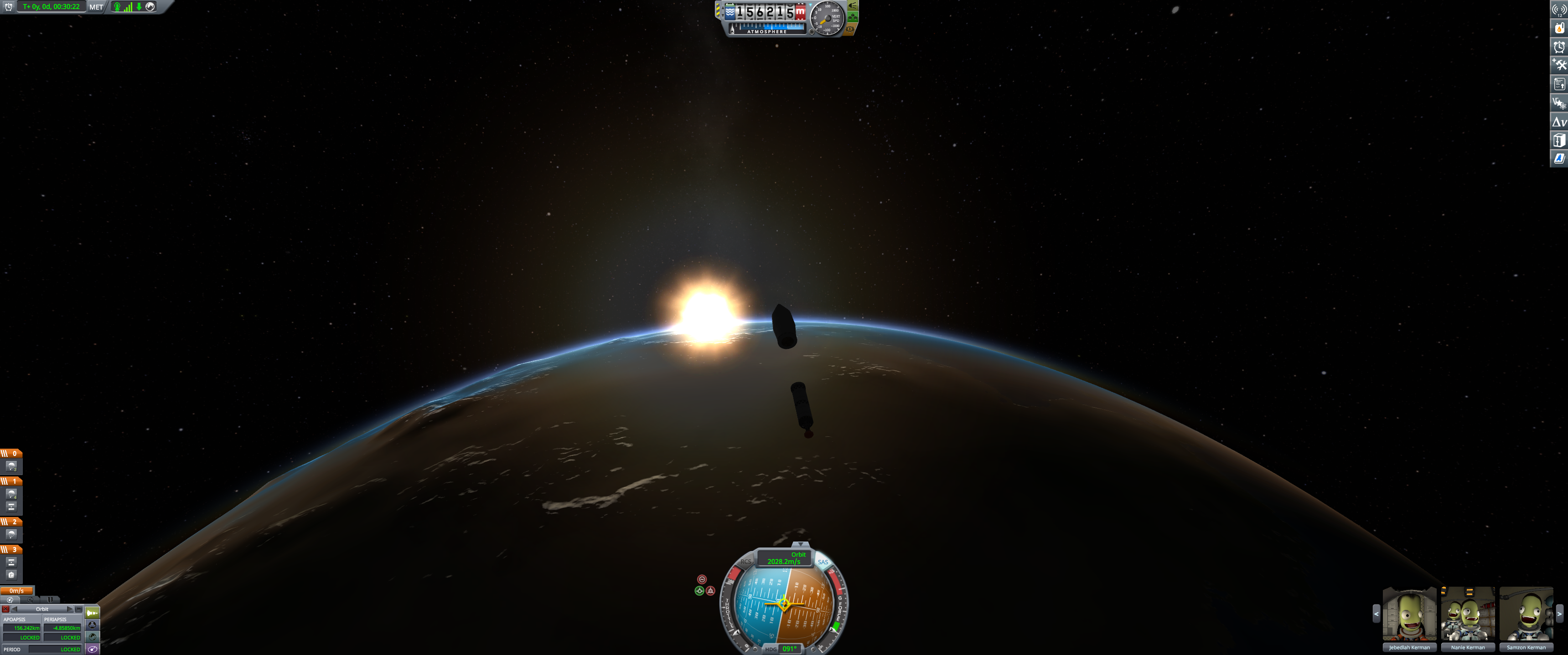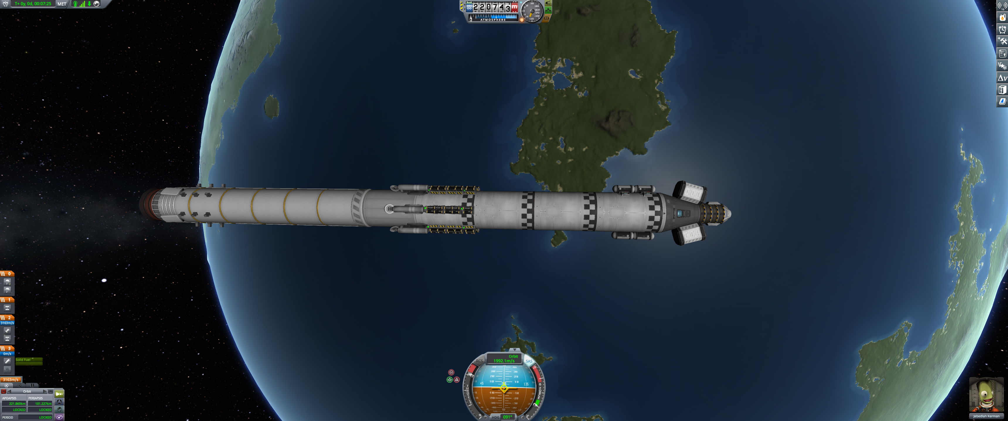 Booster and lander coasting peacefully over Kerbin. Orbital info in bottom left. (Dec 18 2025)