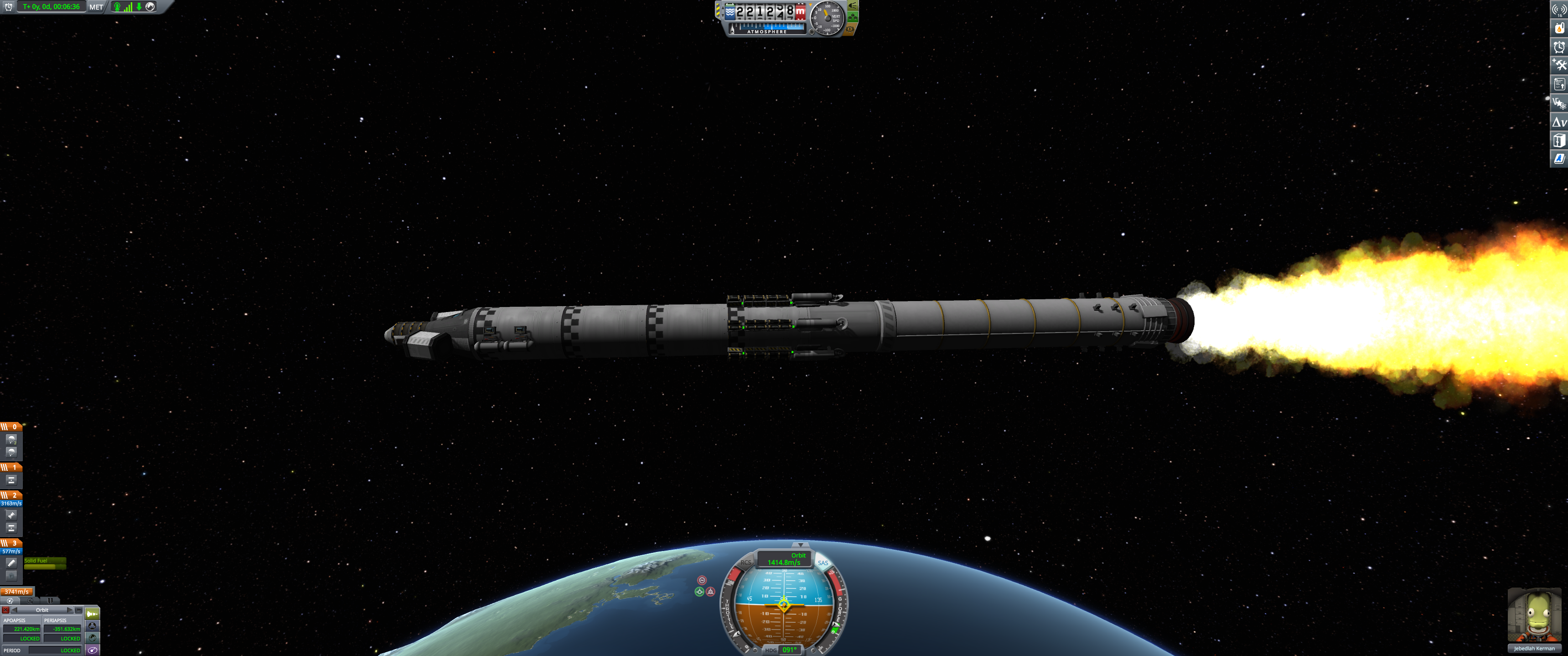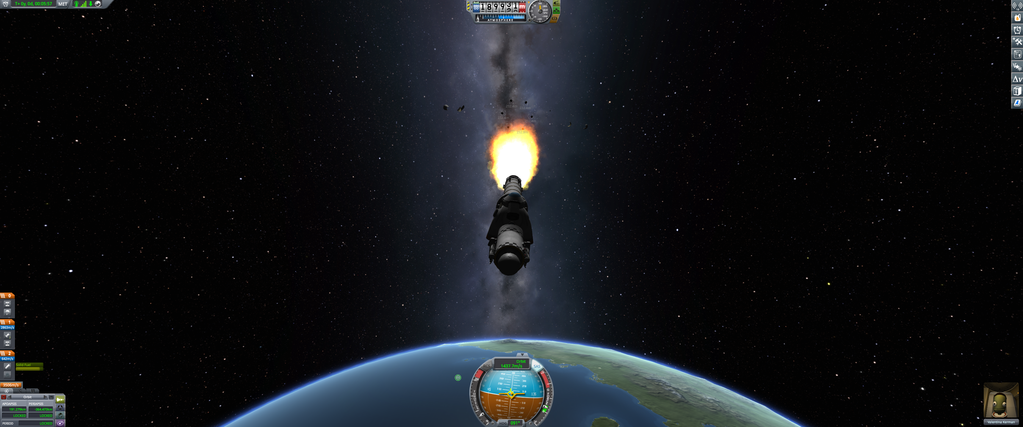 A front view of the vehicle right after staging away the inner Thumper ring. The discarded boosters as well as pieces of fairing are visible behind the vehicle. Valentina has taken over the job of piloting the space program’s various spacecraft after Jebediah turned his sideways Mun lander into a peaceful cottage to spend the rest of his days, and he has unfortunately taken all his piloting experience with him. So now we are back to basics. (Dec 21 2025)